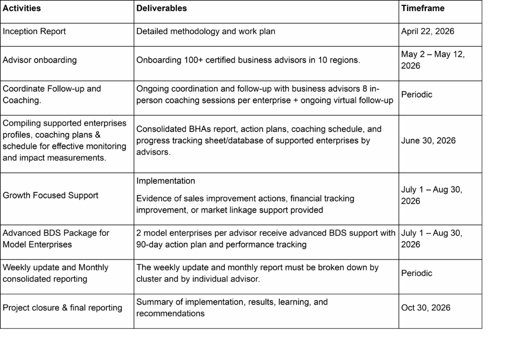 • Establish and oversee the implementation of a demand-driven BDS approach requiring Local Business Advisors to deliver tailored coaching and advanced support (e.g., market linkage facilitation, business expansion, growth acceleration) aligned with the sector and growth stage of each enterprise.